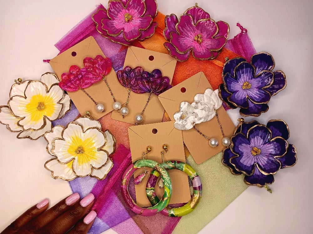 Vibrantly colored, abstract floral patterned full circle hoops with teardrop bead center detail.