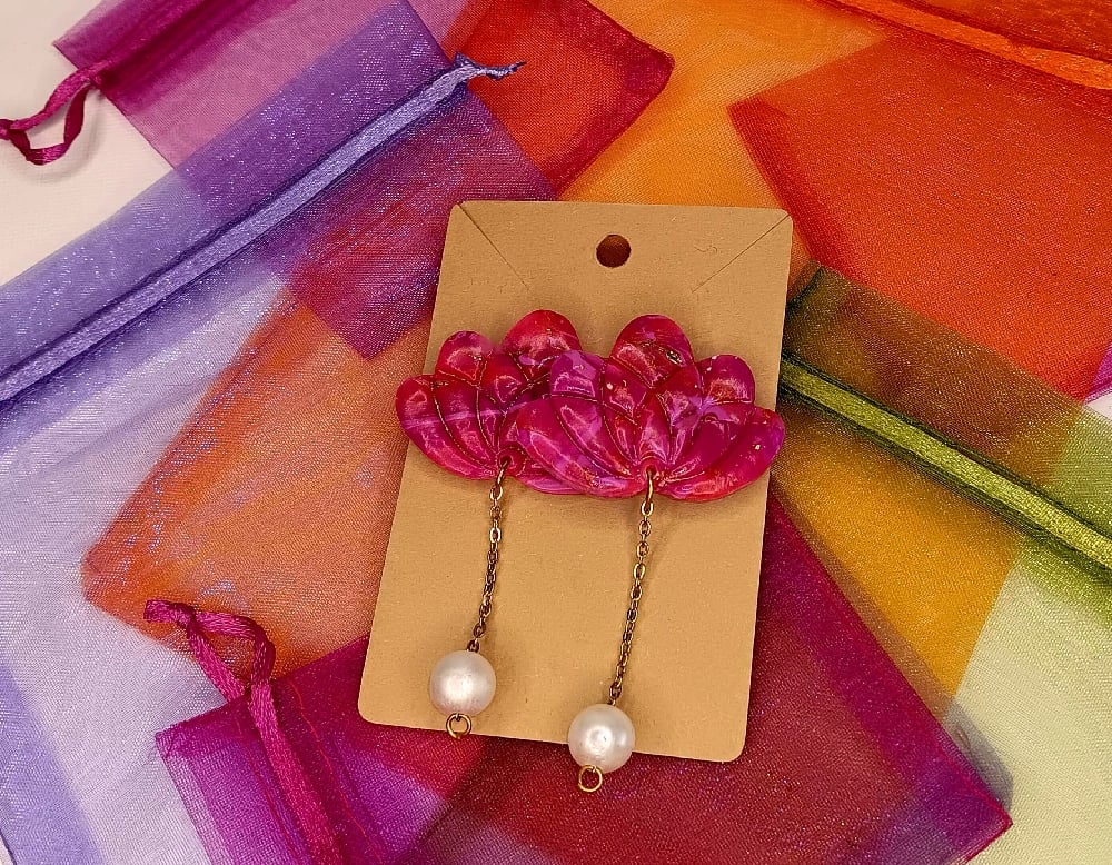 Faux marbled Lotus style earring with pearl bead. Available in Fuschia, Violet, and White
